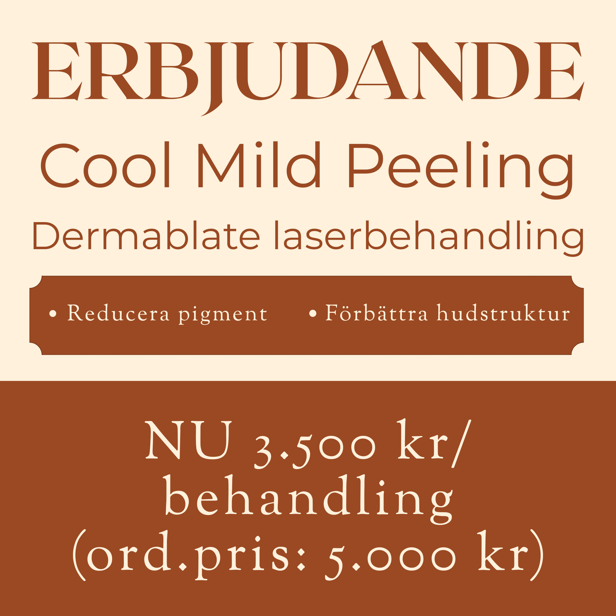 Cool Mild Peeling  är en skonsammare laserbehandling med vår nya Dermablate som ger en förbättring av hudstruktur och reducering av pigment. Eftersom den verkar på lägre temperatur och i ytligare hudlager är återhämtningen snabbare och du får ett jämt och fint resultat. Vi rekommenderar att göra en kur på 2-4  behandlingar, med 4 veckors mellanrum. Huden får en rodnad direkt efter behandlingen som sitter i några dagar. Kombineras gärna med en ansiktsbehandling hos Jenny.